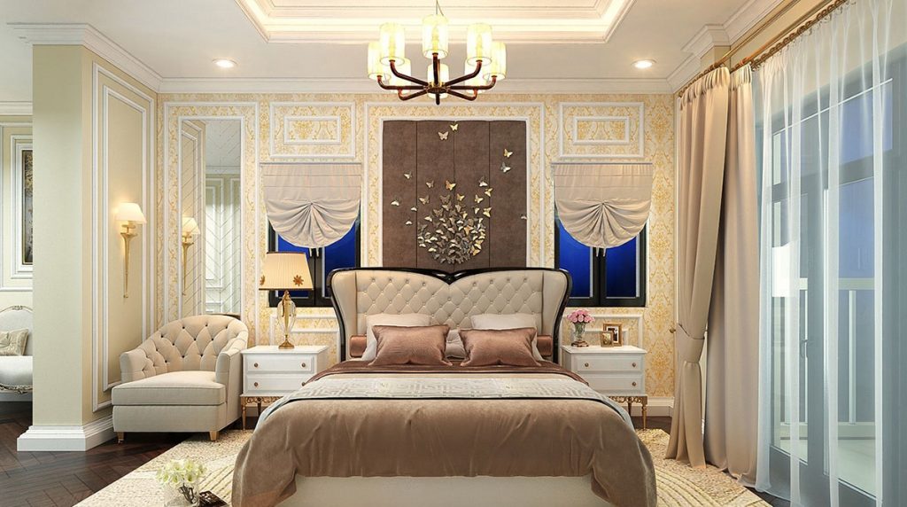 Để có được một căn phòng ngủ biệt thự cao cấp sang trọng, cần đảm bảo các yếu tố ánh sáng và màu sắc cân đối, hài hòa. Lựa chọn giấy dán tường sẽ giúp căn phòng bạn không còn lộn xộn bởi các mảng màu không đồng đều, hay các lỗi nhỏ trên tường.