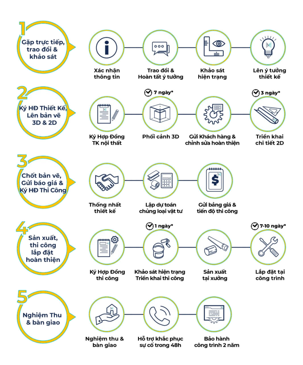 Để đem đến cho quý khách hàng trải nghiệm dịch vụ chuyên nghiệp, rõ ràng, nhanh chóng, cũng như cơ sở có thể tự theo dõi tiến độ dự án của mình. Quy trình 5 bước thiết kế thi công nội thất tại Hoàng Anh và các thông tin chi tiết trong quy trình sẽ đáp ứng được đầy đủ nhu cầu của quý khách hàng.
